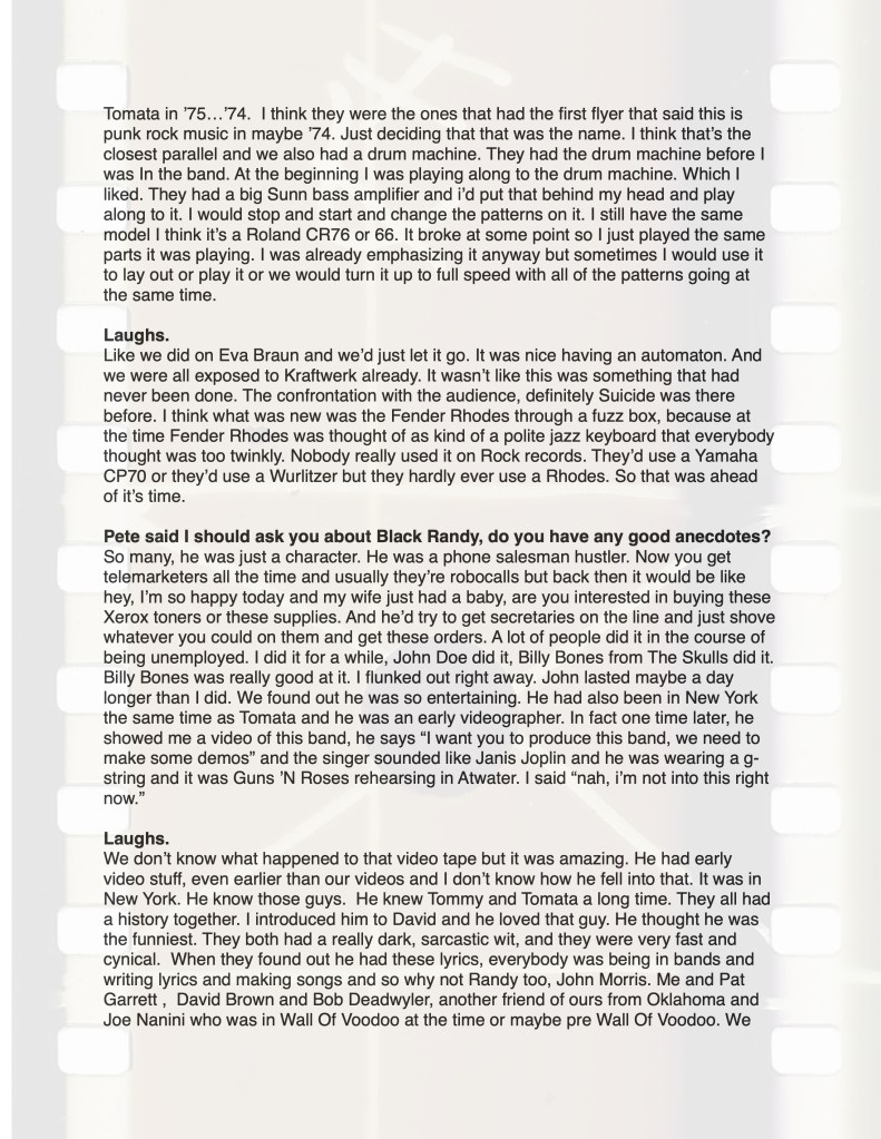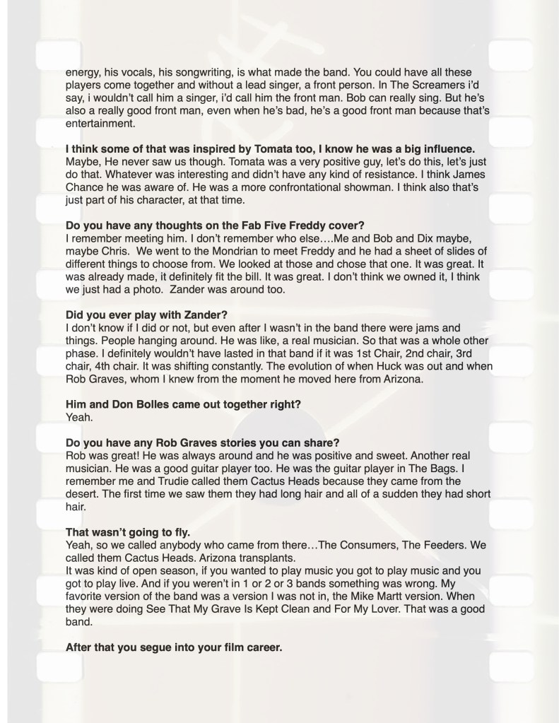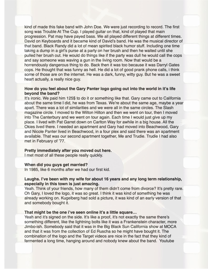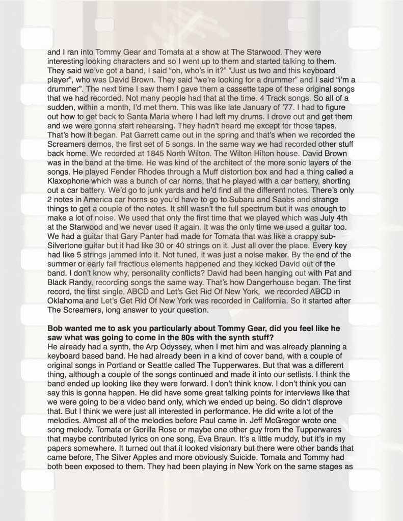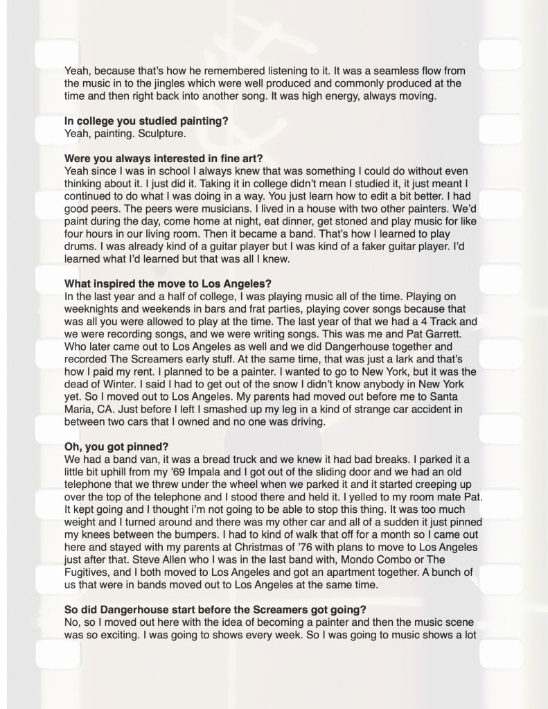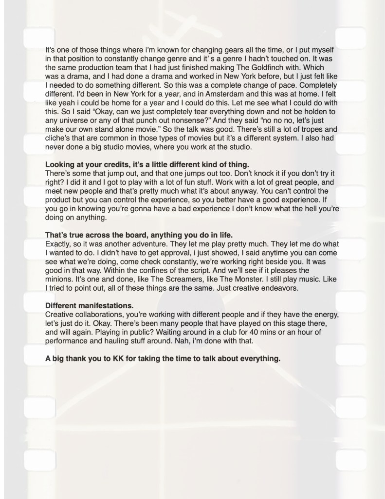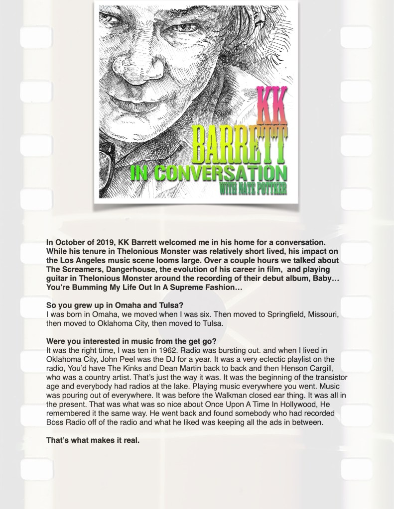 KK was also the drummer for the legendary L.A. punk era band The Screamers. Since 1986 he has worked as a production designer.